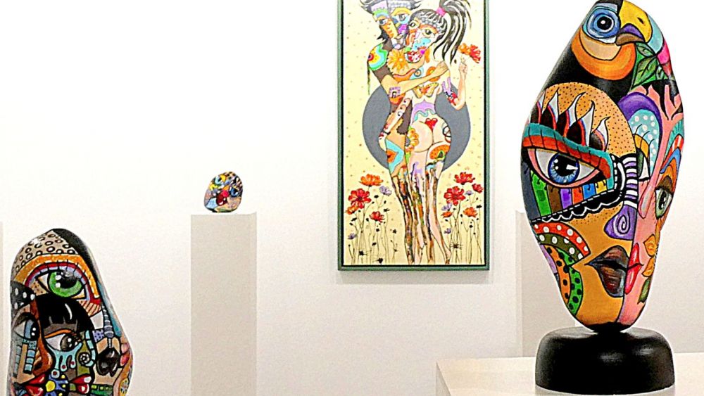 Sorprende la obra escultórica de esta artista que utiliza piedras y máscaras para llevar vida a diversos rostros humanos. Rostros que rodean los volúmenes con su bella y colorista “sabiduría”. Y son rostros también los que aparecen en las planicies de una tela, una madera o un cartón, en su arte pictórico, tan bien definidos que el espectador puede jugar a deshacer el puzle y no lo va a lograr, porque todo allí es una mágica mole que se sostiene, por sí misma y en conjunto, con una verdadera personalidad.