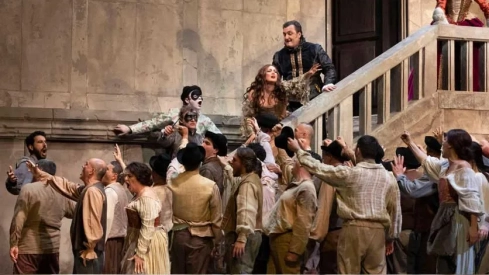 Cines Van Gogh retransmite este jueves a las 19:30 horas una grabación de esta ‘Gioconda’ de 2024. Se trata de una coproducción con el Liceu (donde está justo representándose ahora, por el 150º aniversario de su estreno en La Scala), y la firma el francés Romain Gilbert, con lujoso vestuario de Christian Lacroix. En Nápoles llevaba medio siglo sin representarse, así que el joven director prefirió «no hacer nada radical» ni trasladarla al presente. Como sucede con ‘Tosca’ y Roma, ‘La Gioconda’ no puede desligarse de la Venecia del siglo XVII: el libreto indica espacios muy concretos, como el Palacio Ducal o la Piazzetta. Así, la ambientación de este montaje es histórica, con decorados elegantes, austeros y clásicos del suizo Etienne Pluss. Sin embargo, nunca parece una postal turística, sino que se mueve «entre la luz y la tiniebla», en palabras de Gilbert. A momentos festivos como el carnaval y el ballet de la corte siguen otros lúgubres, con iluminación de claroscuros. En los canales hay barro, crímenes, espías, traiciones, y el tono se vuelve cada vez más nocturno, lleno de fatalidad.