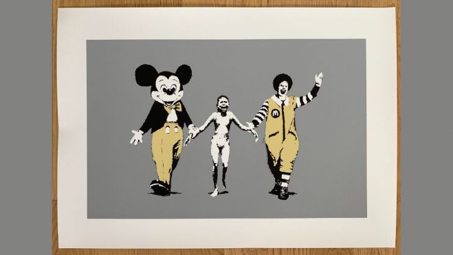 Un WFP es justo lo que tiene el coleccionista. Un WFP de la serie ‘Napalm’ de Banksy que «no es un simple póster» –lee Melón Arroyo el certificado–, pues «West Country Prince produce réplicas artesanales utilizando exactamente los mismos métodos que Banksy usó a principios de los 2000 con Pictures on Walls: serigrafía manual, papel de alta calidad y fidelidad total a las dimensiones».