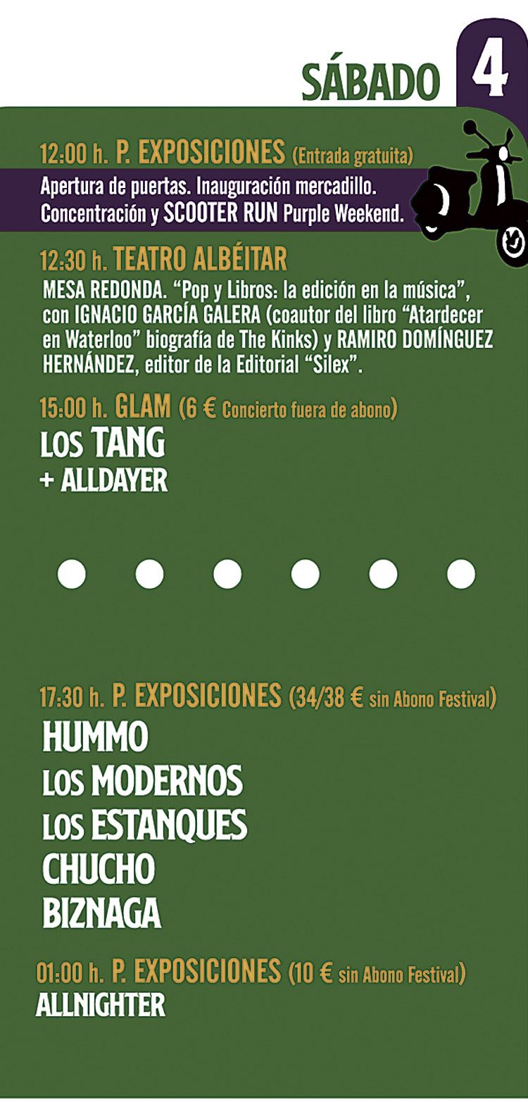 El Teatro El Albéitar servirá de escenario a las 12:30 horas a la celebración de una mesa redonda sobre ‘Pop y libros: la edición en la música’, que contará con la presencia de Ignacio García Galera, coautor del libro ‘Atardecer en Waterloo. Una biografía de The Kinks’ que ha editado Silex, cuyo responsable, Ramiro Domínguez, acompañará al coautor en la mesa.Con el fin de calentar motores de cara a la maratoniana jornada de tarde, la sala Glam Theatre, en pleno Barrio Húmedo, acogerá un concierto vermú a las 14:30 horas protagonizado por la banda local Los Tang, concierto que se encuentra fuera de abono y que tendrá una entrada de 6 euros. También habrá pinchada con Ger antes del concierto y con Ángel Snap y F.G. Díez tras la finalización del mismo. El grupo leonés de power pop cuenta en su formación actual con Laura González (guitarra y voz), Javi Llu (guitarra), JuanMa Carrera (bajo) y Patxi García (batería).