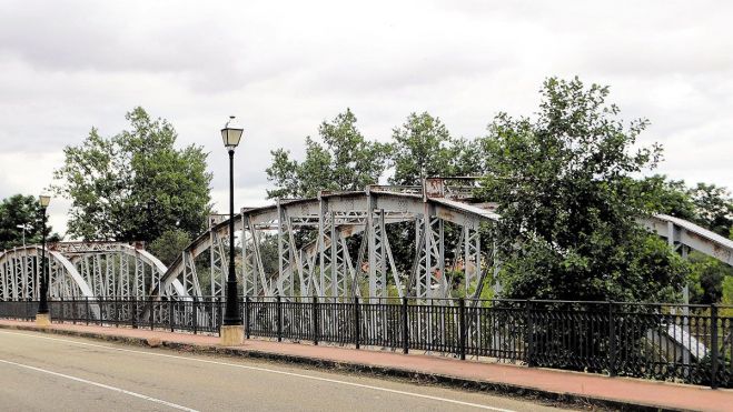 Dado que en ese punto el cauce se ensancha por efectos de meandros y cúmulos de arenas y lodos, se construyó un puente largo, de 90 metros de longitud que apoya en estribos y una pila intermedia creando dos amplios vanos adintelados de 30 metros de luz cada uno, discurriendo los cauces normales por el de la derecha, situándonos desde aguas arriba.Estos puentes-viga de acero se construyen o montan uniendo una serie de perfiles de variada sección y calibre enlazados o anudados por medio de roblones y remaches. En este caso, lo más llamativo son los arcos superiores de la estructura, potentes y bien visibles en el entorno del río y carretera. Entran dentro de la tipología de puentes-viga bow-string precisamente por la curvatura de sus cordones superiores en un sistema que empezó a poner en práctica el ingeniero Whipper en 1841 y que en España incorporó a sus catálogos de obras públicas el propio Ministerio de Fomento a finales del siglo XIX como una solución más a los –hasta entonces– problemáticos puentes colgantes que empezaban a deteriorarse o colapsarse.