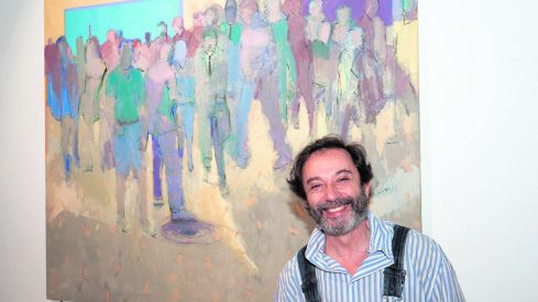 Es un momento en el que se encuentra algo perdido y lo va plasmando en sus obrascomo comenta: “Es como el tentetieso que tengo ahí pintado, estaba yobalanceándome y en el balanceo aprendí causas nuevas y al final volví a quedarme de pie. Ese es un poco el trayecto”.La segunda fase de la que sale una segunda serie coincide con la situación del país, la pandemia y acerca de ello y las obras creadas en esta época nos cuenta: “vivo la pandemia en Madrid y, como mucha gente, tenía que quedarme en casa porque no podía ir al taller, en esta parte hice una serie completa, de la que sólo hay cuatro cuadros colgados aquí y está hecha con los materiales que tenía por casa, que eran obviamente pocos, papel de pintar, de suelo, porque había una tienda cerca de mi casa y me compré un rollo de tapar el suelo. Por la mañana trabajaba en mis historias y por la tarde extendía el rollo en el salón y esta obra para mi fue muy especial, fue el paso, el regreso, un poco hacia la curación, porque en ese momento yo estaba muy conectado a lo que sentía, conectado de una manera muy íntima a todo lo que estabapasando, más que verlo como un espectador yo estaba inmerso en lo que sucedía,muchos de estos cuadros reflejan, no sólo mi estado de ánimo, sino el estado de ánimo de la sociedad, con el agua al cuello, por ejemplo, porque llego a Madrid cuandola crisis de refugiados en el Líbano, la gente venía por el mar y yo tenía esas imágenesde gente sumergida en el agua y empezaron a aparecer en mis cuadros en el aguacabezas, objetos, libros... un poco la sensación de tragedia”.