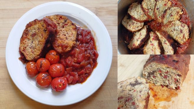 En mi última estancia en Italia, me enseñaron a elaborar esta salsa que de tan sencilla que es, me parece un juego para niños. Aprovechamos el aceite de haber dorado el rollo. Un poco de cebolla en brounoise, y pochar un poco con la ayuda de una pizca de sal. Una buena cantidad de tomate maduro, escaldado, pelado y troceado después de retirar las semillas. A la vez, ponemos unos ajos loncheados. Dejar hacer a fuego lento en compañía de una hojas de albahaca fresca, muy picadina, rectificar de sal y azúcar (personalmente, no lo hago) e introducir la preparación del bonito reservado. Que cueza muy suavemente todo junto. Dejar enfriar para cortar los medallones sin que se deshagan y servir, frío, caliente o templado. Está bueno de todas las maneras. Me encanta acompañar con unos rojos Cherrys, salteados con otro poco de albahaca. Sin duda estoy en un comedor italiano con sus sabores y aromas.