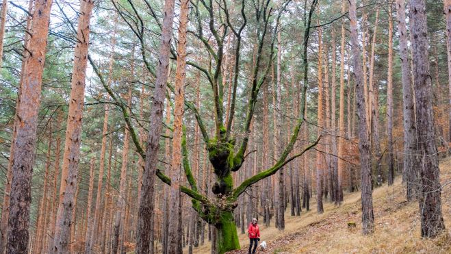 Casi medio kilómetro después de salir de la rotonda hay una curva pronunciada según el terreno y al salir de la misma, se encuentra el panel que informa sobre los robles centenarios que se ven por la parte de abajo. En ese punto se deja el amplio camino para tomar una senda que va pasando por los robles a lo largo de más de 300 metros y antes de encontrar el cortafuegos que se encuentra bajo la línea de alta tensión, donde el sendero sube al camino, continuando la cuesta arriba, primero en dirección sureste para girar a Sur y, tras un Km y medio entre el pinar, se toma en la parte alta del Rabizo un camino a la izquierda entre los pinos y un poco después de hacer el giro se ve a la derecha un espacio circular sin árboles con un túmulo en recuerdo a los represaliados de la guerra civil.