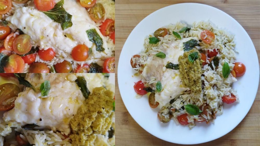 Un sauteuse al fuego. Ponemos arroz, tipo basmati. Ya sabéis, fino, aromatizado, de origen indio o paquistaní, e inmediatamente mojamos con el doble de caldo o agua. Ponemos una cucharada de olivada verde (se pican olivas verdes con Aove en un procesador) removemos y dejamos cocer tapado unos 4 - 5 minutos. Ponemos encima el pescado elegido en lomos o filetes e inclusive en tronchas. Los Cherrys variados, cortados en mitades y aliñados con sal, pimienta molida, Aove, unas gotas de vinagre, un poquito de orégano, y unas hojinas de albahaca picada con las manos, también lo incorporamos. Colocamos la tapa de la cacerola. Bajamos la potencia del fuego a medio o suave y dejamos cocer durante 10 minutos. Apagar el fuego y servir completando con una cucharada de la olivada elaborada, unas hojitas pequeñas de albahaca y un hilín de la mejor aceite de oliva virgen extra. Hemos conseguido un plato sabroso, dulce, salado, perfectamente armonizado que resultará del agrado de todos los comensales.