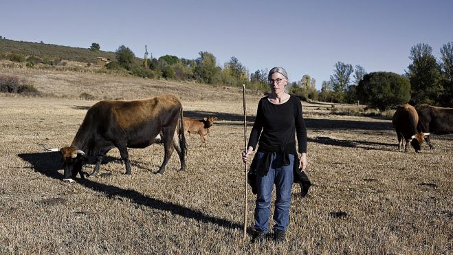 «Cinco años de carrera universitaria y un máster para cuidar vacas...»; bromea Benedicto González, Bene, al observar a Flor León Martín dando de comer a las vacas de la ganadería de ambos en Navafría de la Sobarriba.