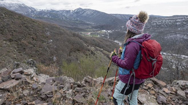 A partir de este punto el sendero se hacía más estrecho, casi un surco aunque en estos últimos tiempos lo han desbrozado y ensanchado aunque continúa en fuerte subida. Al final se llega a una zona sin bosque en la que se ve un hito y después otro que sube hacia el bosque, dejando el camino a la izquierda que va en descenso hacia el oeste, hacia la localidad de Valle de Vegacervera.