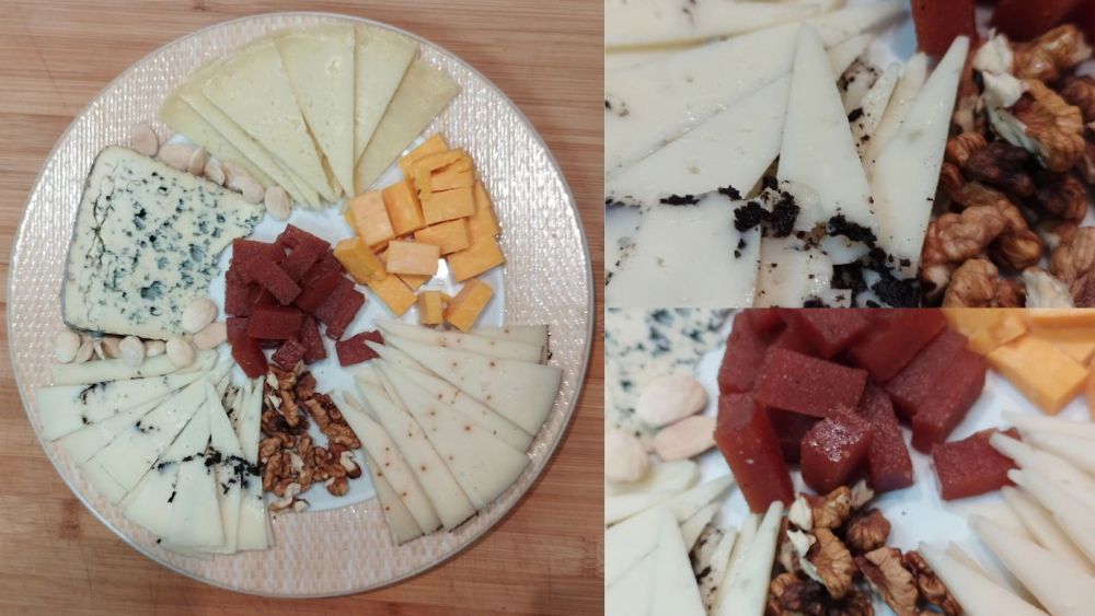 Nunca presentaría más de cinco o seis variantes del producto lácteo, y en la selección, ofreceríamos, de lo más suave a lo fuerte. Atendiendo siempre a los gustos de quién nos acompañe. Complementaremos con otros productos dulces, salados, frutas, frutos secos. Nunca me olvidaré de un exquisito membrillo en taquines... siempre se dijo: «uvas con queso, saben a beso...». Aquí tenéis que jugar con vuestra imaginación y respetando mucho el producto.