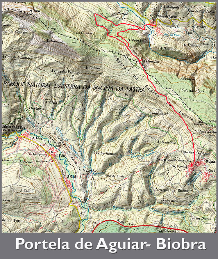 Se vuelve de nuevo al camino para seguir entre robles y encinas, así como algún que otro madroño llenos de frutos a lo largo del invierno, encontrando varias señales ya en territorio gallego, así como otro mirador, esta vez hacia la zona de la cuenca del Sil hacia la comarca de Valdeorras. Se sigue el camino y al final se desciende hasta la localidad de Biobra, donde se puede visitar el Centro de interpretación del Parque así como contemplar las construcciones típicas de la zona.