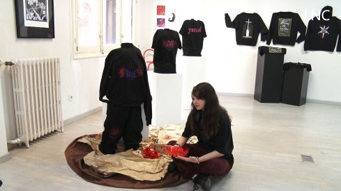 Tras pasar por el ciclo formativo de grado medio, la alumna, encandilada por la serigrafía, decidió embarcarse en los estudios del superior. Ahora es una de los once estudiantes que muestran hasta el 27 de abril su obra final en el enclave capitalino, vistiendo a los maniquíes que yacen estáticos al final del espacio expositivo, pero también a algunos de sus compañeros.