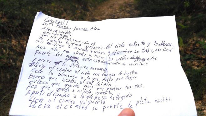 La huella de esas horas a pleno aire es lo que contiene el libro que se presenta ahora titulado ‘El viento ya está escrito’ (Ediciones Menguantes) y que contiene, además de poemas, manuscritos, dibujos, fotografías y la voz del poeta. En un autor como Pascual, en el que la experiencia poética supone sobre todo vivencia, la voz ha sido determinante; por ello el libro, a través de un teléfono móvil, lleva mediante un código directamente a su voz y a los paisajes sonoros que se han grabado con la colaboración de Luis Martínez Campo con la mayor pureza, respetando el método de este poeta por el cual no recita sino que vuelve a vivir la intensidad de la experiencia que generó el poema.El resultado no es poesía exactamente, o no sólo poesía, ni es fotografía, ni teatro, ni arte sonoro, es lo más cercano a la experiencia directa de un hombre que siente en plena naturaleza, viviendo el paisaje. «Camino vándalo de golondrinas y susurros», se puede leer en una de sus páginas, como si con el poeta fueran por el campo no todas las cosas que ansía sino todas las visiones que anhela. «Cuánto cabe de sol en una mano» se pregunta instantes después de intentar contener un rayo en el hueco de la suya. En otra ocasión se tumba en el invernal suelo de un bosque caduco, cuyas ramas ascienden como nervios desde la tierra al cielo, se pone en el pecho el teléfono móvil y filma una película de minuto y medio en la que su voz se empareja con los esqueletos de los árboles de primavera dormida.