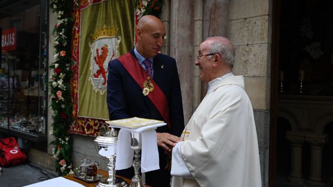 La cita religiosa contó, entre otras, con la presencia del presidente de las Cortes de Castilla y León, Carlos Pollán, y de otros responsables institucionales que no quisieron faltar a uno de los actos más relevantes de las fiestas de la ciudad, al que las autoridades acuden acompañadas de la Policía Local de gala y de la Banda de Música Municipal, que interpretó el Himno a León y el Himno de España.