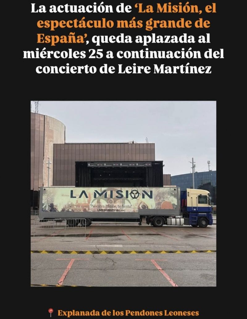 La actuación será aplazada y se celebrará este miércoles 25 de junio, tras el concierto de Leire Martínez, ex vocalista de La Oreja de Van Gogh, en el que será su primer concierto en solitario. El concierto de Leire será a las diez de la noche y, a continuación, subirán al escenario los músicos y bailarines de La Misión para dar a León una noche inolvidable.