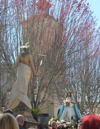 Las dos salen de la iglesia de San Pedro, pero en direcciones opuestas hasta encontrarse en otro lugar de la plaza donde la Virgen, cubierta con un manto negro (enlutada) pasa a lucir otro de azul turquesa. A continuación, todos se encaminan hacia la iglesia para asistir a la misa del Domingo de Resurrección.