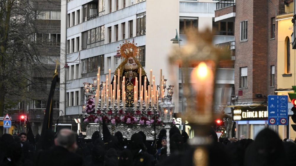 Por segundo día consecutivo, los pasos cofrades se encaminaron de nuevo hacia el entorno de Santa Nonia para asistir a la procesión más multitudinaria del Martes Santo leonés. Desde las ocho de la tarde y hasta más de las once y media, la procesión del Dolor de Nuestra Madre, de la Cofradía de Angustias y Soledad, llenó de luto las calles de la ciudad con ese dolor inmensurable que reflejan a su paso las tres imágenes marianas que protagonizan este cortejo de la cofradía decana de la ciudad de León.