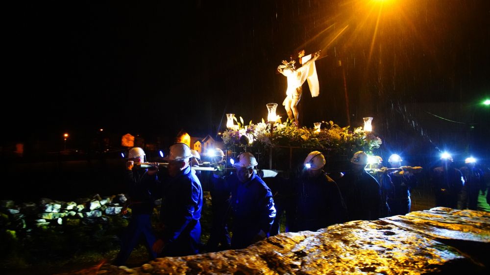 Los mineros de Caboalles de Abajo quitaron el protagonismo a la lluvia en la tarde y la noche del Viernes Santo. Trasladaban al Cristo de los Mineros y a la Virgen Dolorosa a la iglesia vieja de Santa María, pero tuvieron que volver tras sus pasos por las condiciones meteorológicas. Sin embargo, éste no iba a ser el final.