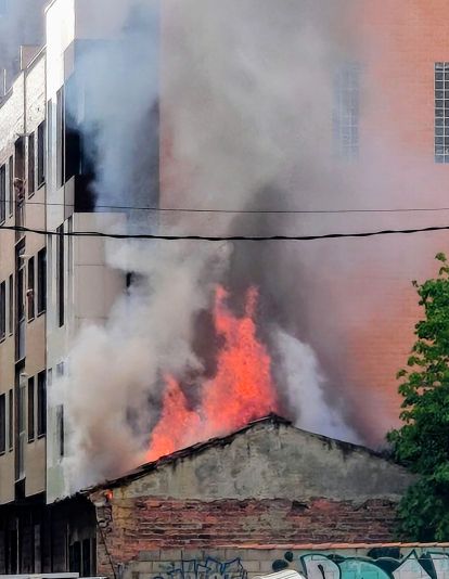 En estos momentos, efectivos de los Bomberos de León se encuentran sofocando las llamas del incendio que han provocado una gran humareda, a la par que tratan de evitar que el fuego se propague a los edificios colindantes.