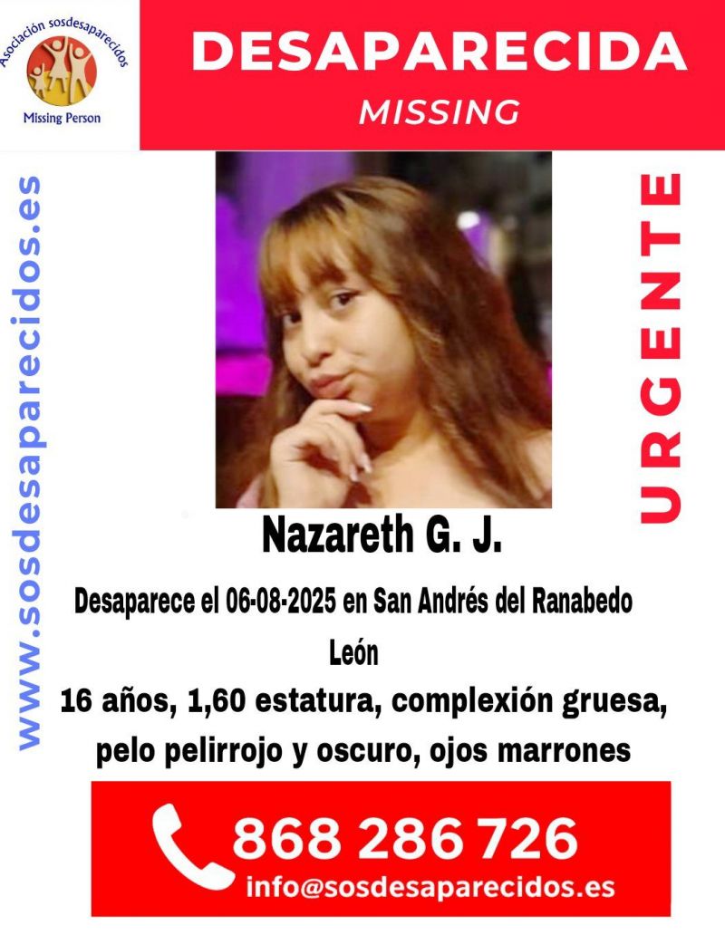 La plataforma SOS Desaparecidos ha publicado una alerta de búsqueda para encontrar a una menor de 16 años que ha desaparecido en San Andrés del Rabanedo. Fue vista por última vez el miércoles 6 de agosto y su familia no tiene noticias sobre su paradero, por lo que han solicitado la colaboración ciudadana y policial para dar con su paradero.