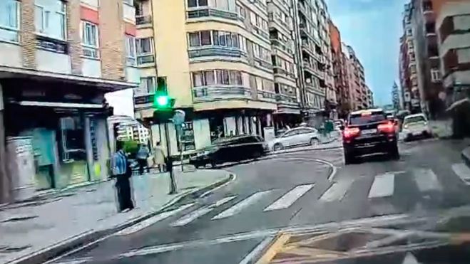 En el vídeo se puede ver como el vehículo siniestrado, que aparece a toda velocidad descendiendo por la calle Dama de Arintero, estando a punto de colisionar con el coche que le precedía. A tenor de las imágenes, parece que en su maniobra de intentar no impactar con él, pasa por encima de la isleta y sale disparado hasta colisionar con la puerta de la panadería, evitando por pocos metros a las tres personas que esperaban para cruzar en el paso de peatones.