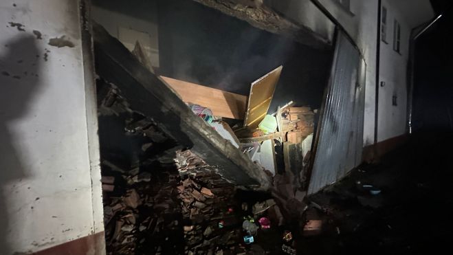 A la llegada de la dotación de bomberos, la parte afectada de la vivienda estaba envuelta en llamas con importante carga térmica y produciéndose explosiones. Una vez controladas las llamas, se produjo el derrumbe del forjado del primer piso, que por fortuna no se produjeron daños personales.