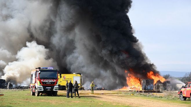 Un incendio en un almacén de plásticos y neumáticos en las inmediaciones de La Bañeza en la madrugada de este miércoles ha puesto en alerta a los vecinos y las autoridades ante la presencia de productos tóxicos porque además ha provocado una fuerte y densa humareda negra.