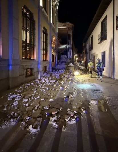 Bomberos y Policía Local acudieron a la zona para protegerla y asegurarla, en un suceso que pone el foco en el estado de algunos edificios del casco antiguo de la ciudad.